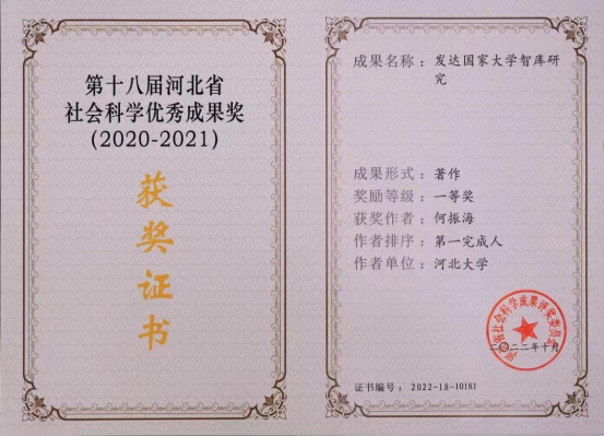 近日,新葡京官网教育学院何振海教授的著作《发达国家大学智库研究》荣获了第十八届河北省社会科学优秀成果奖一等奖。